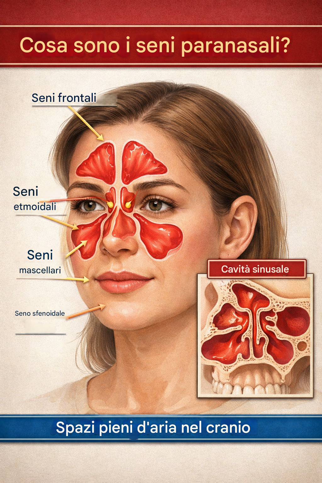 I seni paranasali sono cavità vuote piene d'aria situate nelle ossa del cranio, principalmente dietro la fronte (frontali), sulle guance (mascellari), tra gli occhi (etmoidali) e in profondità dietro gli occhi (sfenoidali).