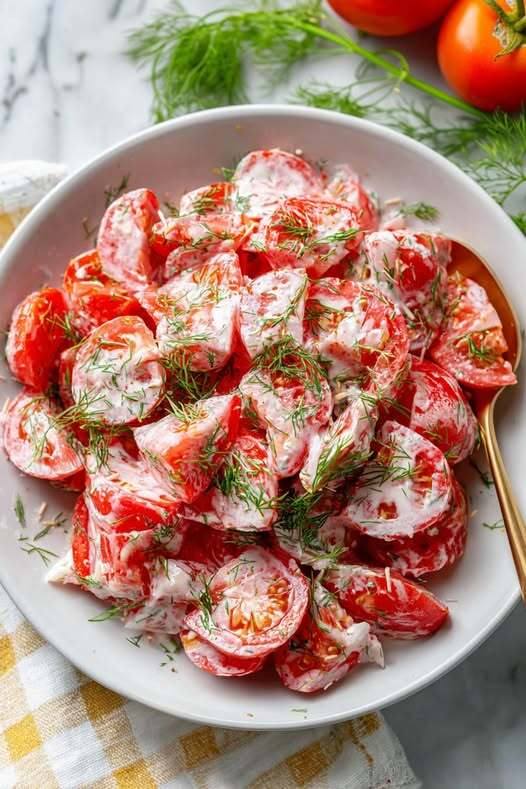 Dite addio alle verdure insipide e date il benvenuto a questa vivace insalata senza cottura, ricca di sapore. Pomodori succosi incontrano un cremoso condimento all’aglio, aneto fresco e un pizzico di acidità in un piatto che si sposa bene con le carni alla griglia o che può rubare la scena al vostro prossimo pranzo in comune. È semplice, appagante e crea dipendenza.