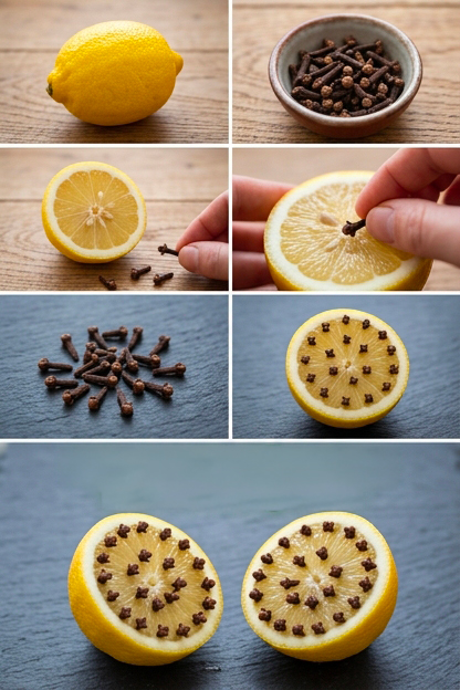 Tagliate un limone a metà e infilateci dentro una decina di chiodi di garofano, come se steste creando un piccolo riccio profumato.